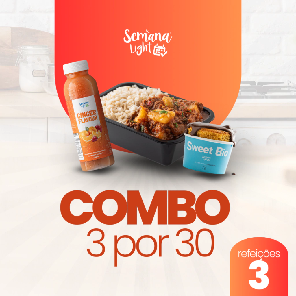 Por apenas R$30, você escolhe uma Refeição Leve, um Suco e uma Sobremesa dentre várias opções deliciosas. Tudo o que você precisa em um só pedido! Praticidade, sabor e economia reunidos no combo perfeito para o seu dia.